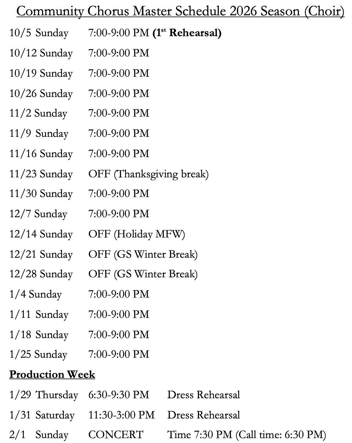 Welcome to the GS Community Chorus Master Page! Here you will find all important information, music, rehearsal schedules, and more for our 2025-2026 season. Regular emails will still be sent out, but this page will act as an organizing home base for all our needs.